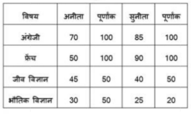 तालिका में अनीता और सुनीता नामक दो सहेलियाँ द्वारा एक सेमेस्टर परीक्षा में विभिन्न विषयों में प्राप्त अंकों को दर्शाया गया है। उनके कुल प्राप्त अंक प्रतिशत में कितना अंतर है?