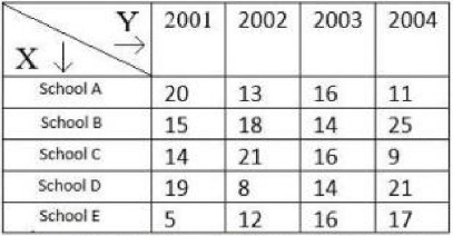 दी गई सूची के अनुसार, कितने विद्यालों ने दो क्रमागत वर्षों में 15 से कम स्वर्ण पदक (Gold Medal) जीते? X = विद्यालय (School), Y= वर्ष (Year) I