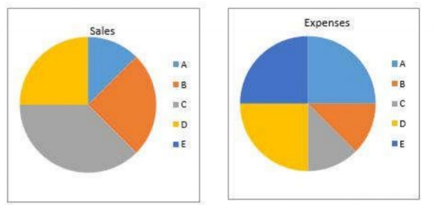 The pie charts represent the values of sales and expenses of five companies A, B, C, D, E in terms of percentages.